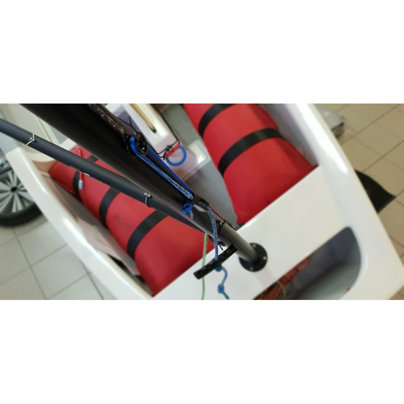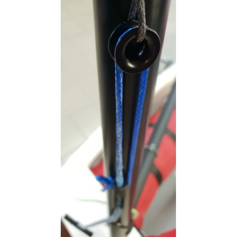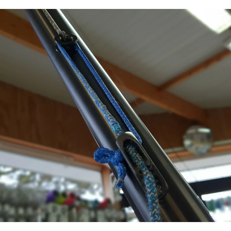 La drisse de livarde – contrôle est la partie du système que l’on a en main pour modifier la tension de la livarde. Le bout de contrôle est dégainé sur la partie qui passe dans l’anneau de friction ou la poulie de la drisse de livarde. la gaine est conservé sur la partie qui va dans le taquet.